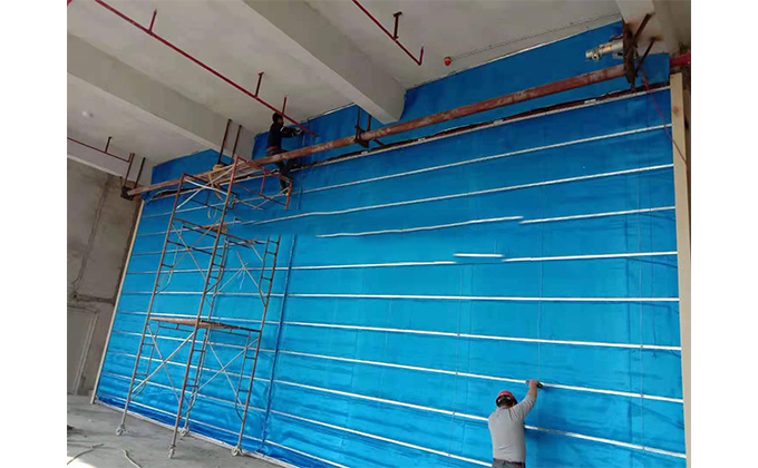擋煙垂簾垂壁根據設計要求和現場實際情況采取如下施工順序:首先,搭設腳手架一放線一打眼--上脹栓一焊骨架。第二,吊件一安裝骨架…